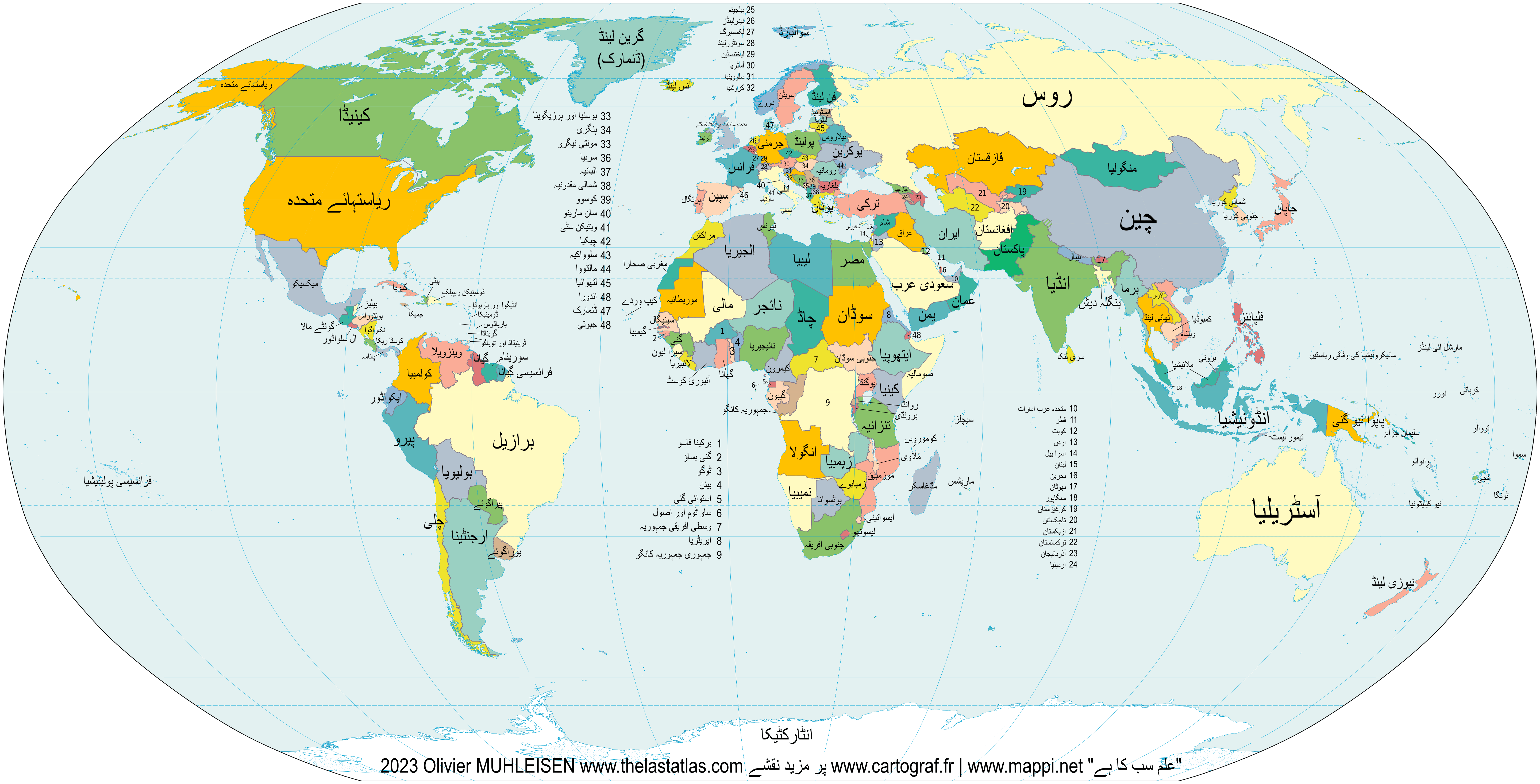 Mapa mundi com países coloridos escritos em urdu